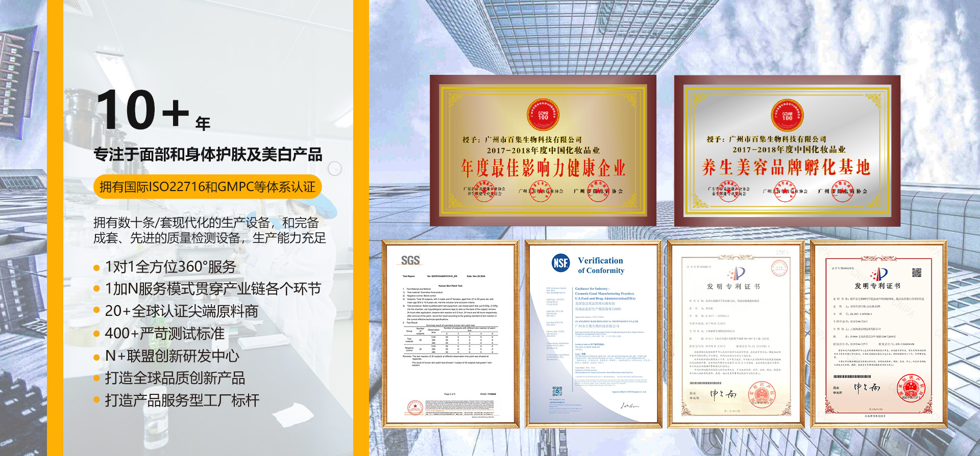 百集生物擁有16位專(zhuān)業(yè)工程師,79多位研發(fā)人員,6000多款成熟配方 百集生物研發(fā)中心占地3000多平方米,擁有成熟的研發(fā)團(tuán)隊(duì)及完善的研發(fā)設(shè)施,使用納米技術(shù)、滲透壓技術(shù)、 液晶微乳化技術(shù)等,已經(jīng)擁有一系列穩(wěn)定性高、滲透性強(qiáng)、吸收性好、效果顯著的成熟配方。