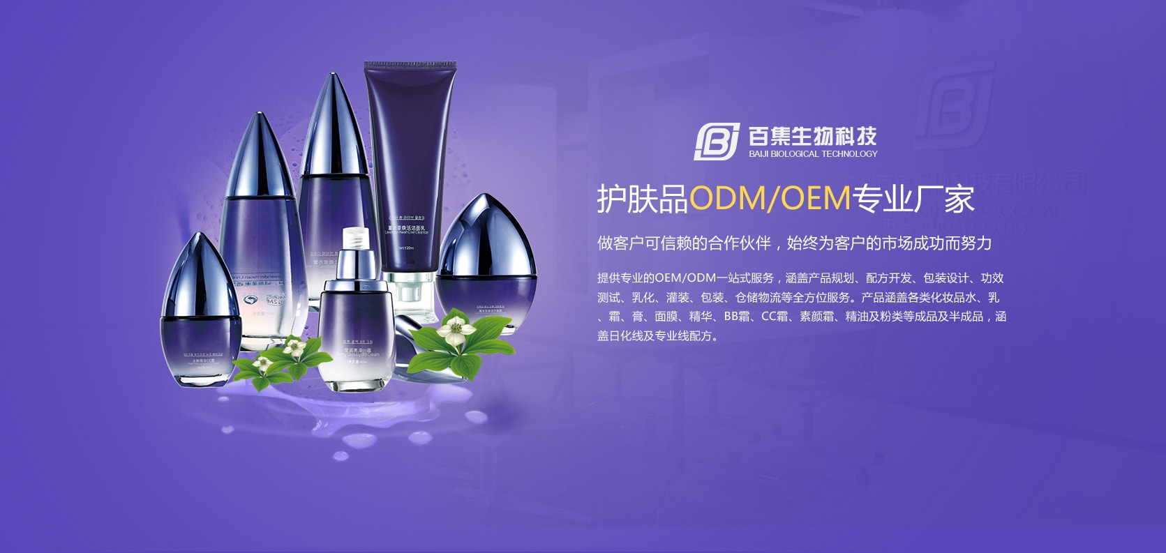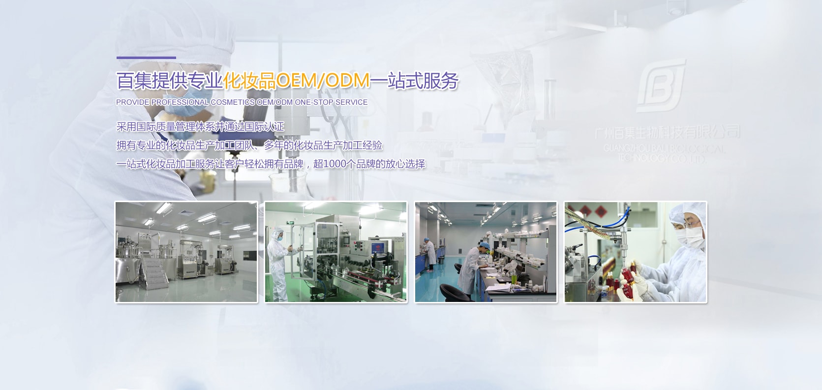 百集生物擁有16位專業(yè)工程師,79多位研發(fā)人員,6000多款成熟配方 百集生物研發(fā)中心占地3000多平方米,擁有成熟的研發(fā)團(tuán)隊(duì)及完善的研發(fā)設(shè)施,使用納米技術(shù)、滲透壓技術(shù)、 液晶微乳化技術(shù)等,已經(jīng)擁有一系列穩(wěn)定性高、滲透性強(qiáng)、吸收性好、效果顯著的成熟配方。
